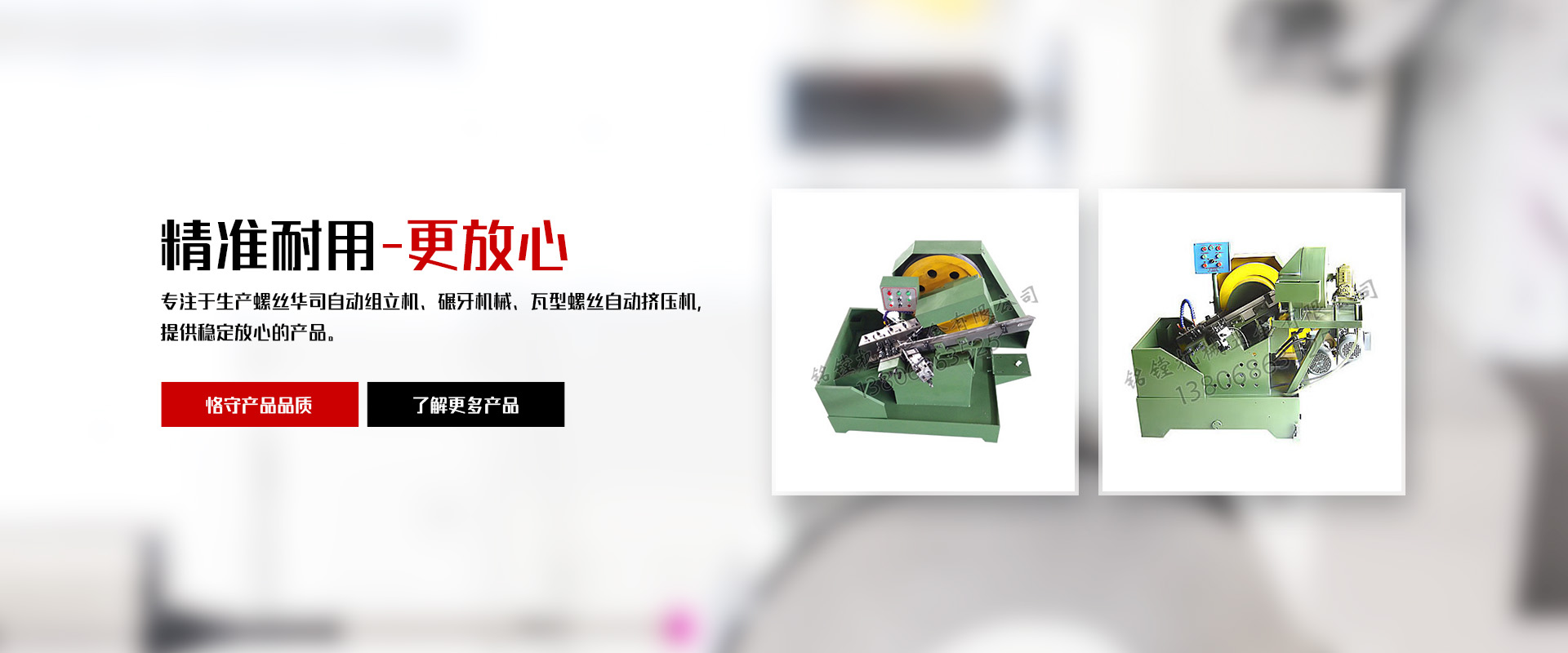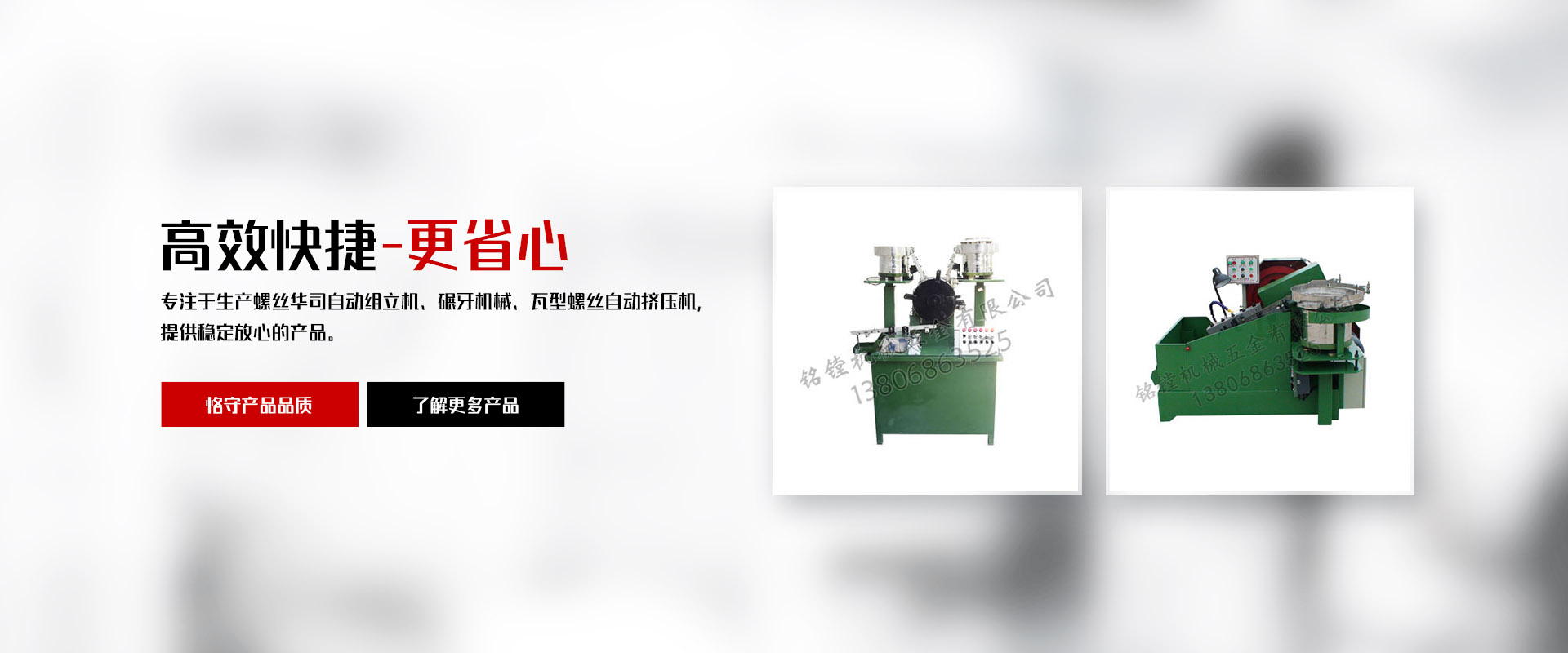 銘鏜機械五金有限公司,位于浙南地區經濟繁榮發達的樂清白象鎮工業園區。公司擁有多年生產螺絲華司自動組立機及碾牙機械,瓦型螺絲自動擠壓機,制造和生產經驗。公司成立至今以先進的技術完善的科學管理、嚴格的產品檢測及質量保證體系、和完善的售后服務體系;贏得廣大用戶的好評和信賴。